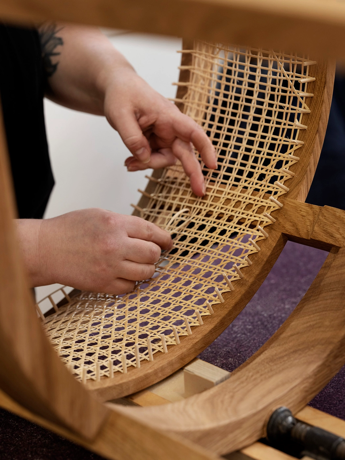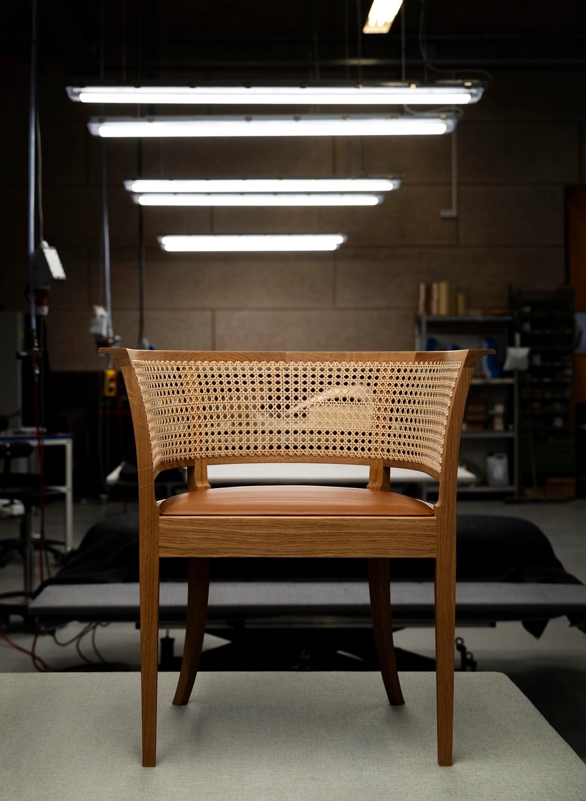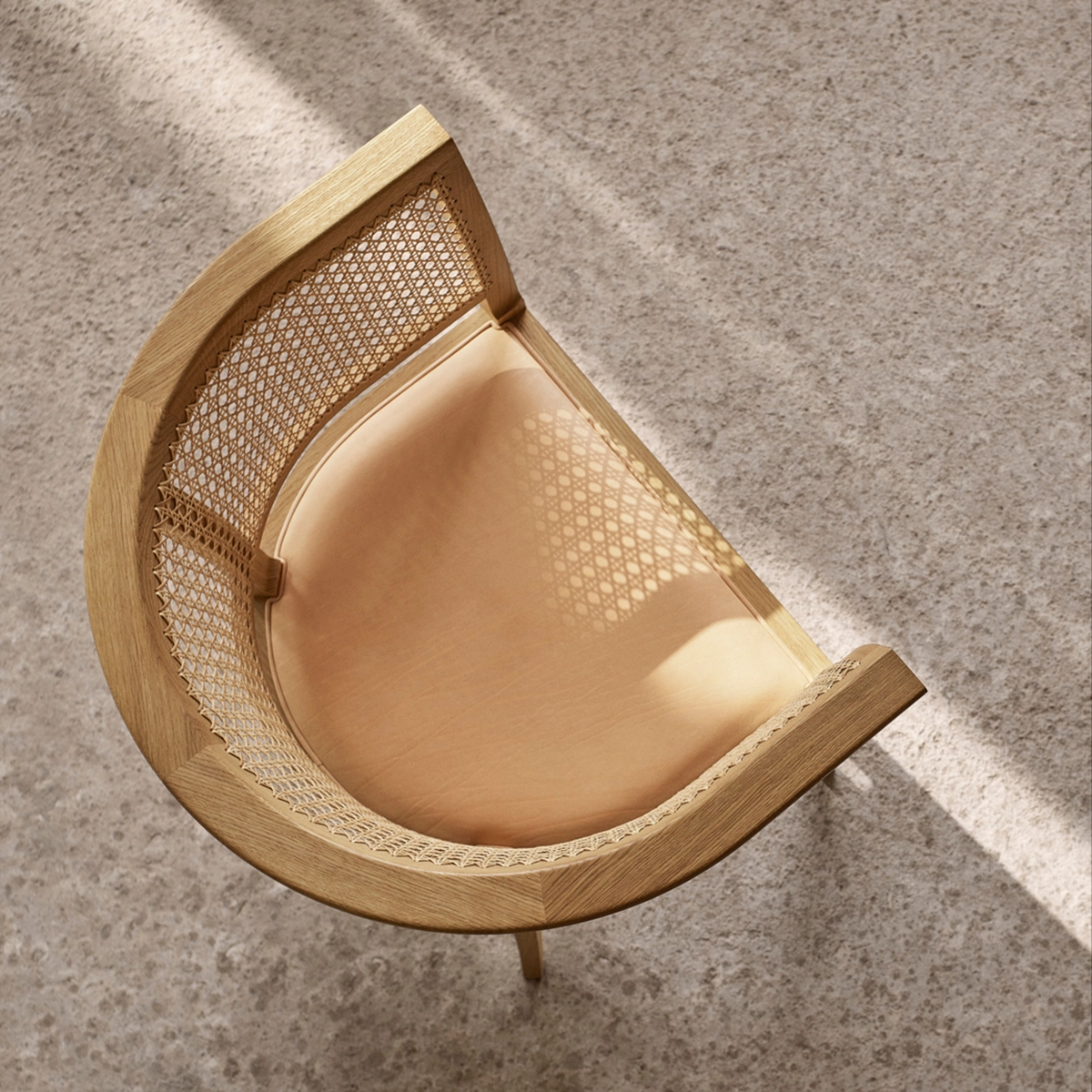 The Faaborg Chair is characterised by its relatively thin legs, tapering to a point at the base, and its curved back, which lend the chair a particularly light, elegant and refined expression. At the same time, the semicircular back extends forward to create an armrest that almost encircles the occupant, providing a sense of privacy while seated. The chair was originally produced with a French rattan seat, sides and back. For greater comfort, the chair has been produced with a seat upholstered with leather or fabric since 1964. The back and sides still feature hand-woven French rattan, and it takes more than 12 hours for a skilled craftsman to weave one chair by hand.