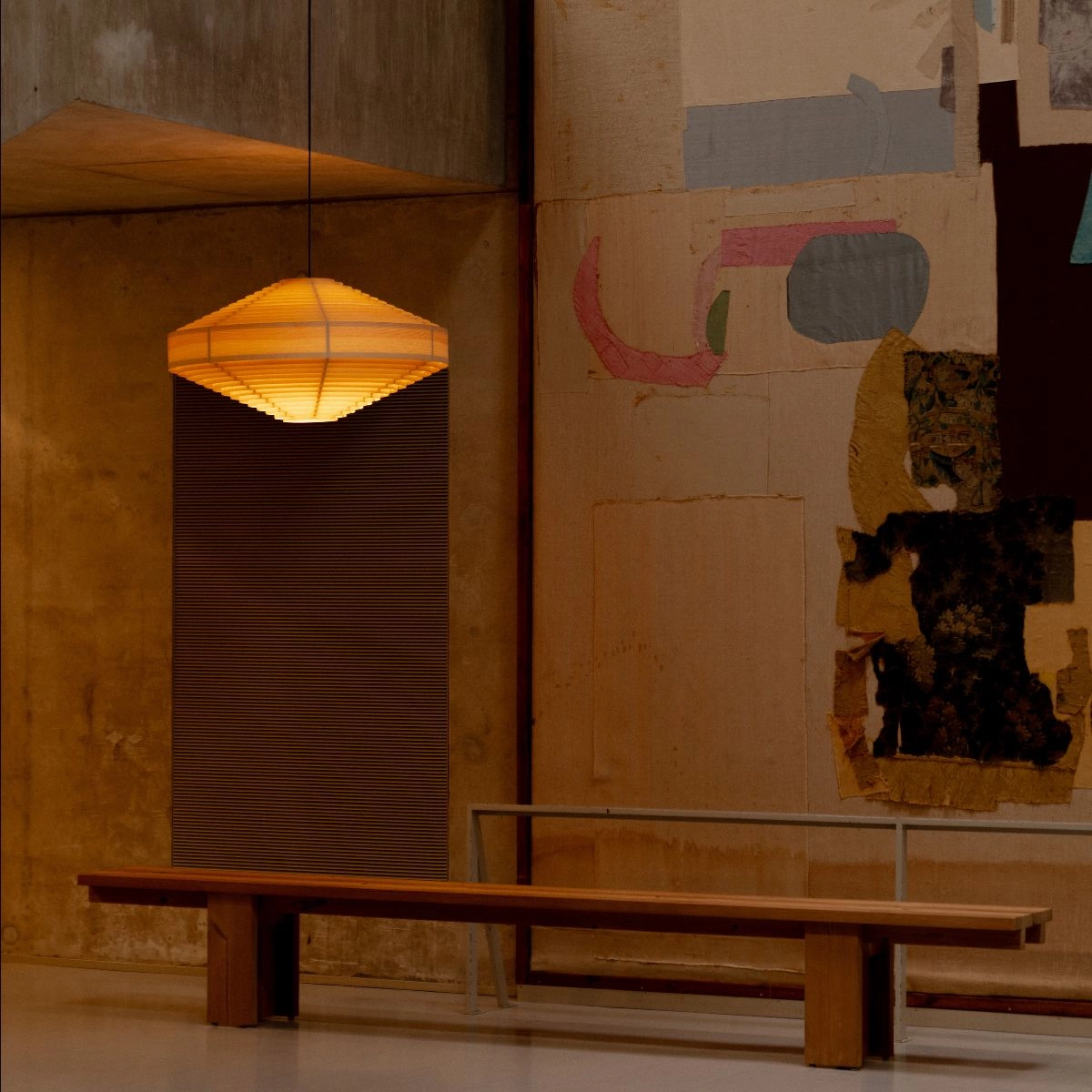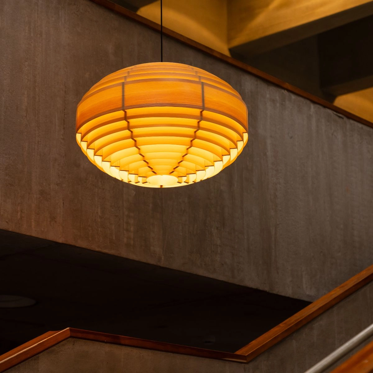 More softly filtered light, more pine surface, more imposing. The 70 cm wide 1002 Hans Pendant XL brings maximum impact to interior spaces with its brutal scale and meters of finest pine veneer. Made in Finland.