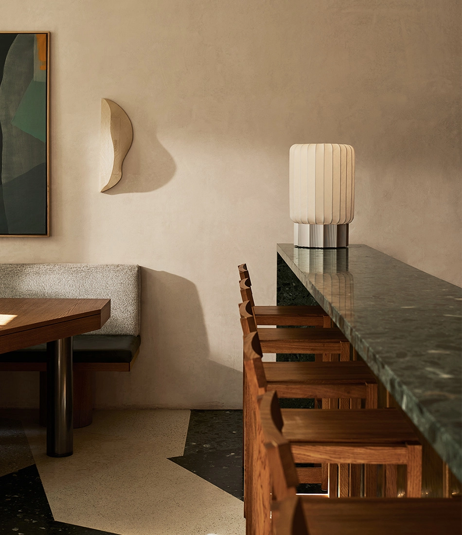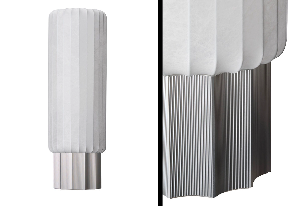 Maria Bruun describes one of the initial ideas behind the design: ”We wanted to create a new interpretation of the classic rice paper lamp. A design sharing its lightness and softness but with a solid sculptural base. We explored contrasting materials to create a unique presence and sculptural reference.”