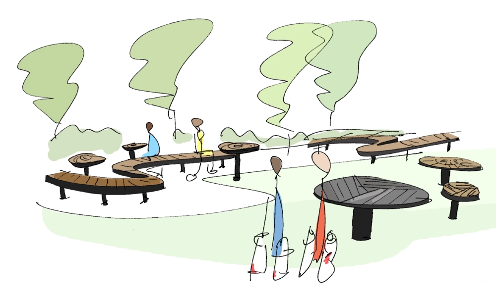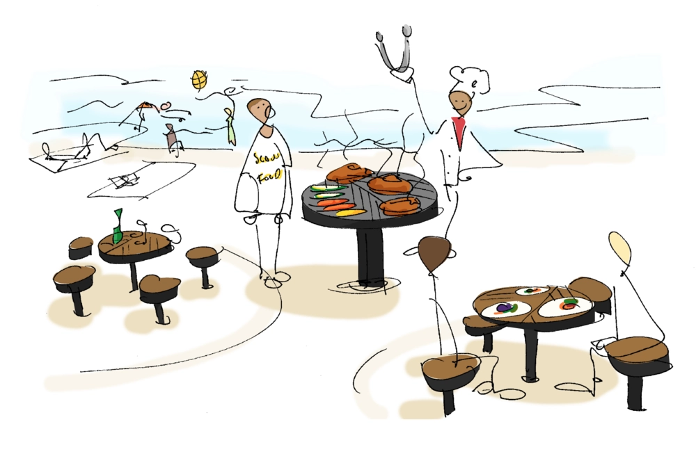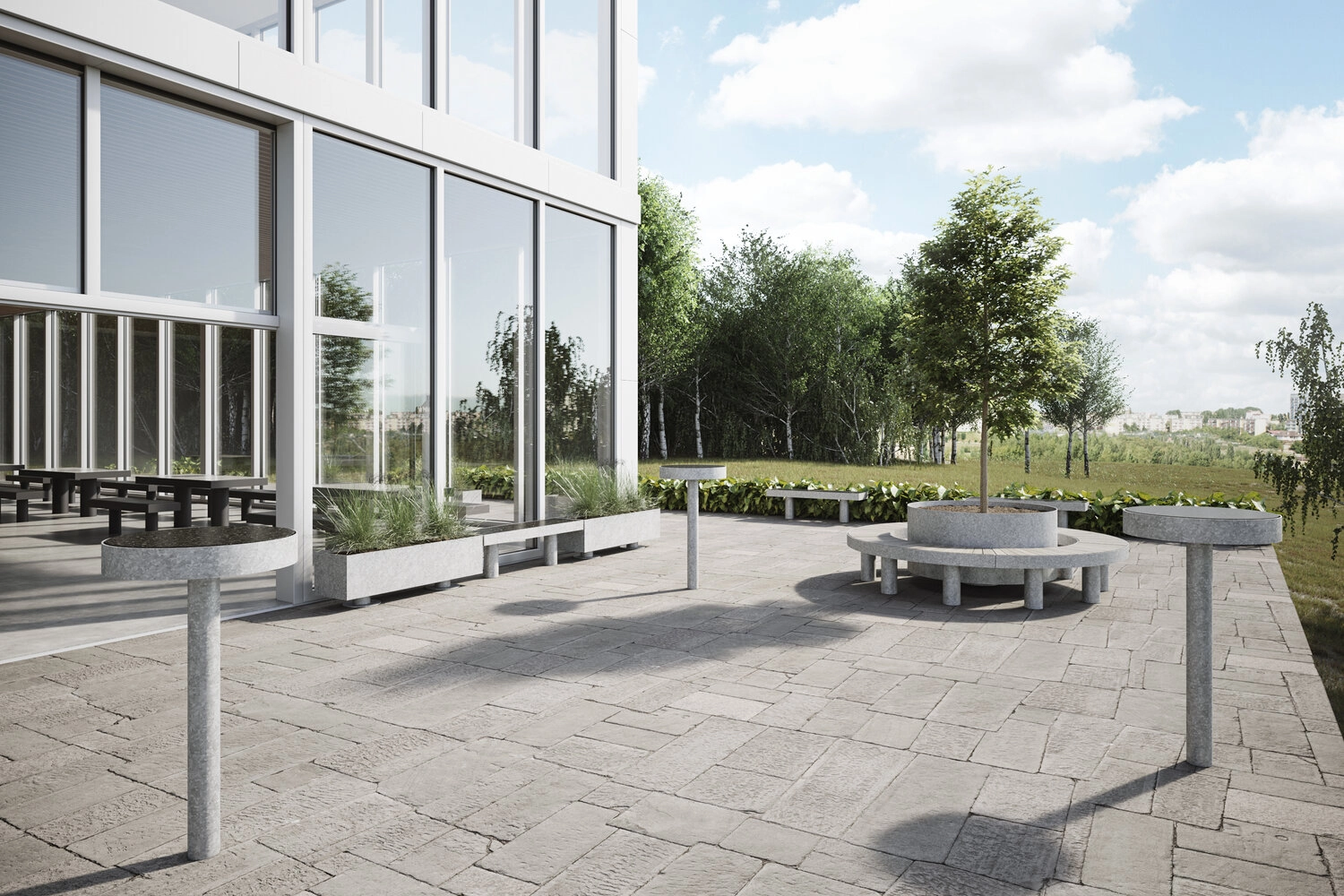 Grills, stools, tables, benches and planters can be arranged sternly and strictly or spread out like wild flowers. The grill furniture family encourages creating more groups rather than one meeting point, even if this of course is possible too. You can also mix different patterns in the same park to create further variation.”