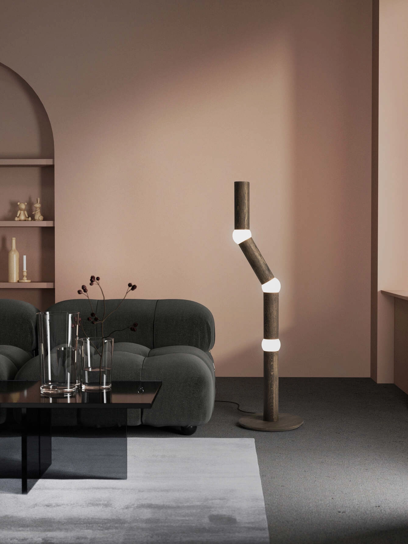 The lamp can be easily used as a single piece aside a sofa for example but also as a group or 2 or 3 creating a small forest or many more to divide space in hospitality projects.
