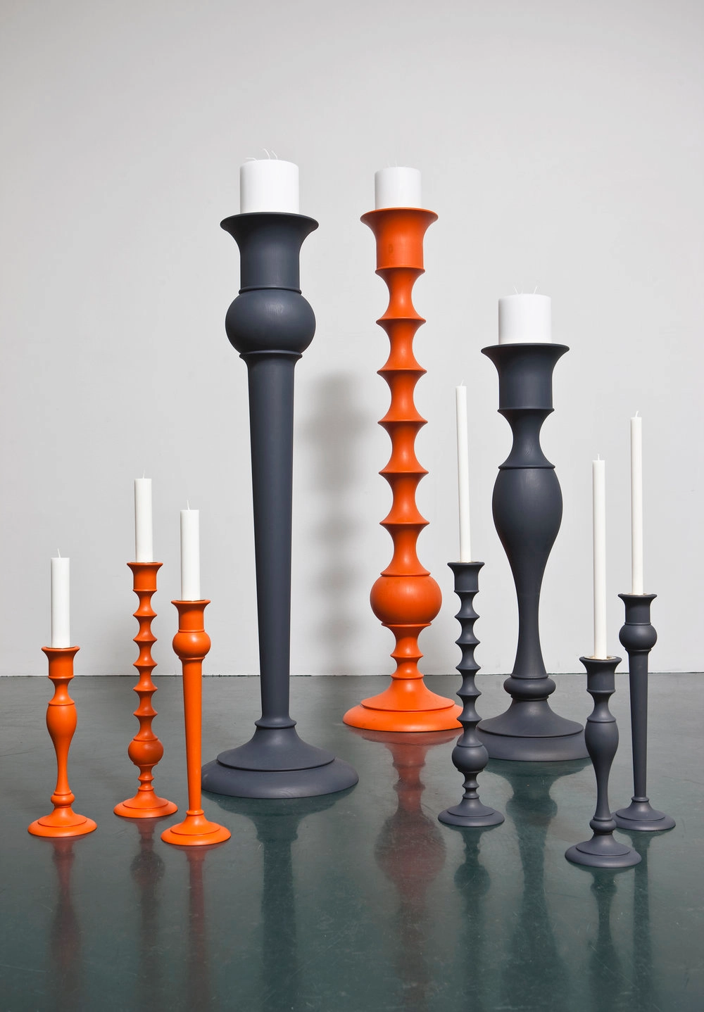The monumental candlestick Holy encourages us to reflect and to celebrate in our everyday lives. Holy embraces the Scandinavian traditions of worship and the importance of illumination during our long winter nights with the magical warmth of the candlelight. The shapes are drawn from classical models, each with its own expression, that complement and interact with each other. They are turned from a single piece of wood, with a natural finish or painted with Swedish traditional colors.