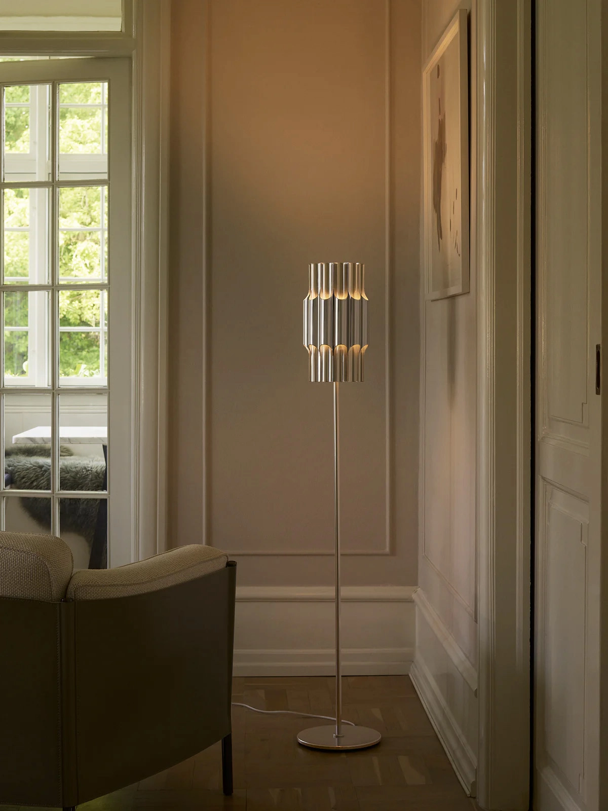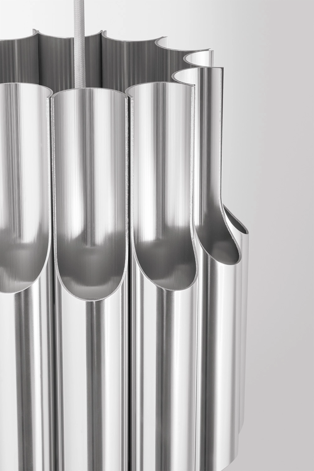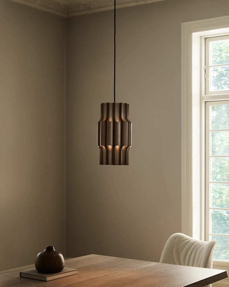 The iconic pendant is designed by Bent Karlby in 1970 and crafted from 12 polished aluminium pipes. While elegantly illuminating its glossy exteriors through its open pipes, the pendant provides comfortable downlight and subtle ambient lighting through its open top.
