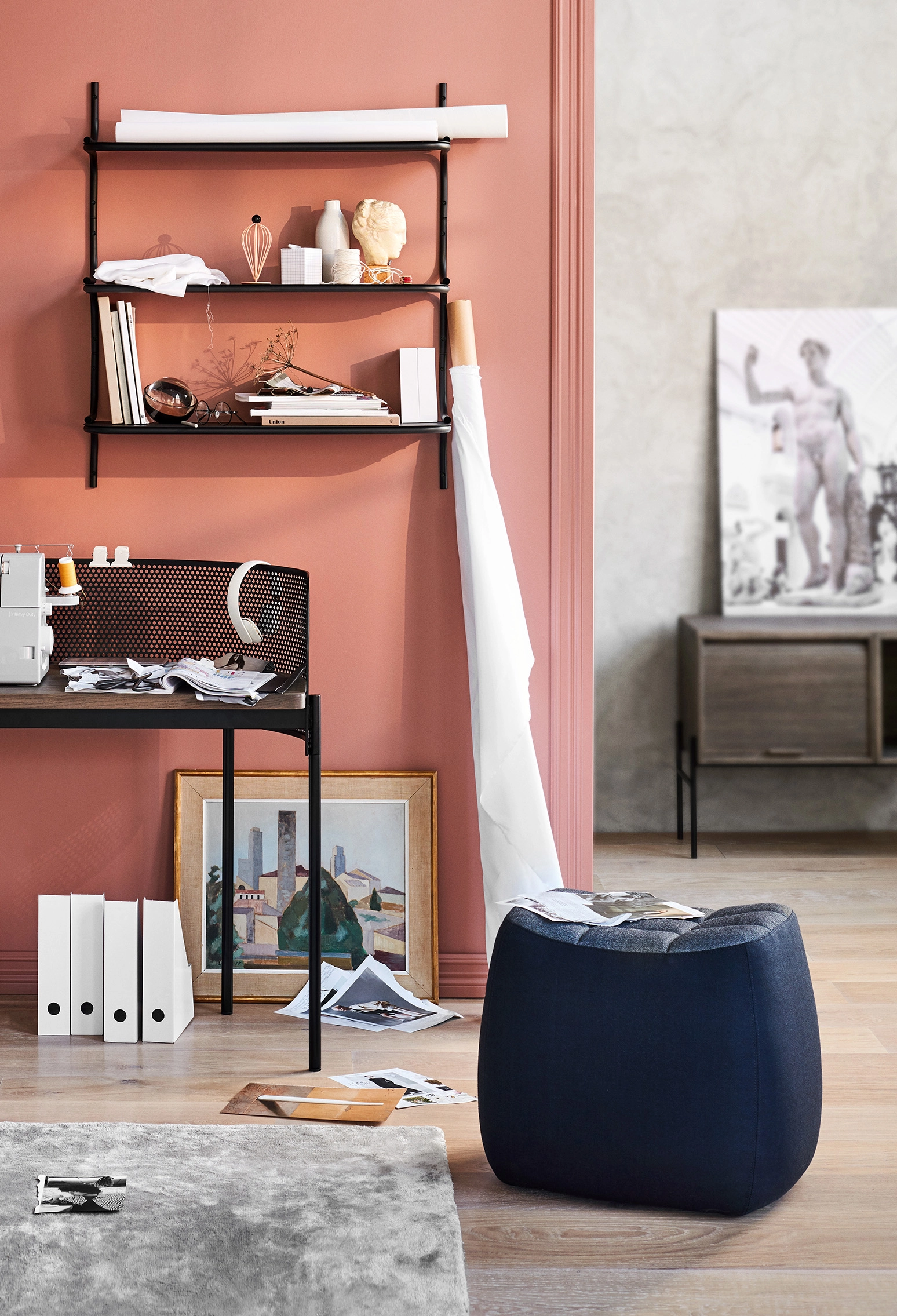 The seats are bordered by a single, unbroken seam that forms a soft edge around the sides. The version with the backrest is shaped by a subtle fold that divides the back from the seat. Each of the designs is available in a selection of fabrics and leather.