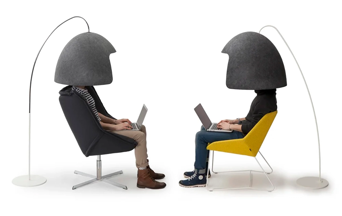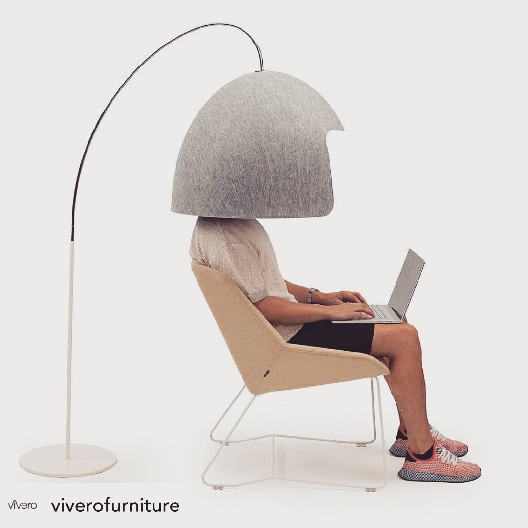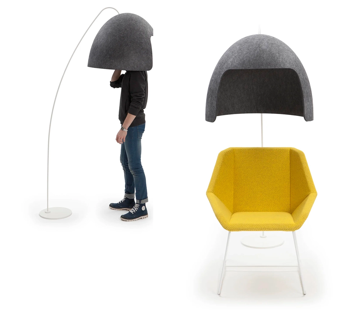 Tomoko is a sheltering, acoustic piece of office furniture for privacy and concentration in open-plan offices, lobbies, recovery rooms and other open spaces. Tomoko helps you to create an immediate territory of your own by eliminating elements that interfere with your concentration, such as noise or visual distractions. At the same time, it signals to others that you are not to be disturbed. At home, Tomoko gives you a quiet place for reading a relaxing book or focusing on your home office work. The hood is made of 100% recyclable polyester felt and the base is powder-coated.