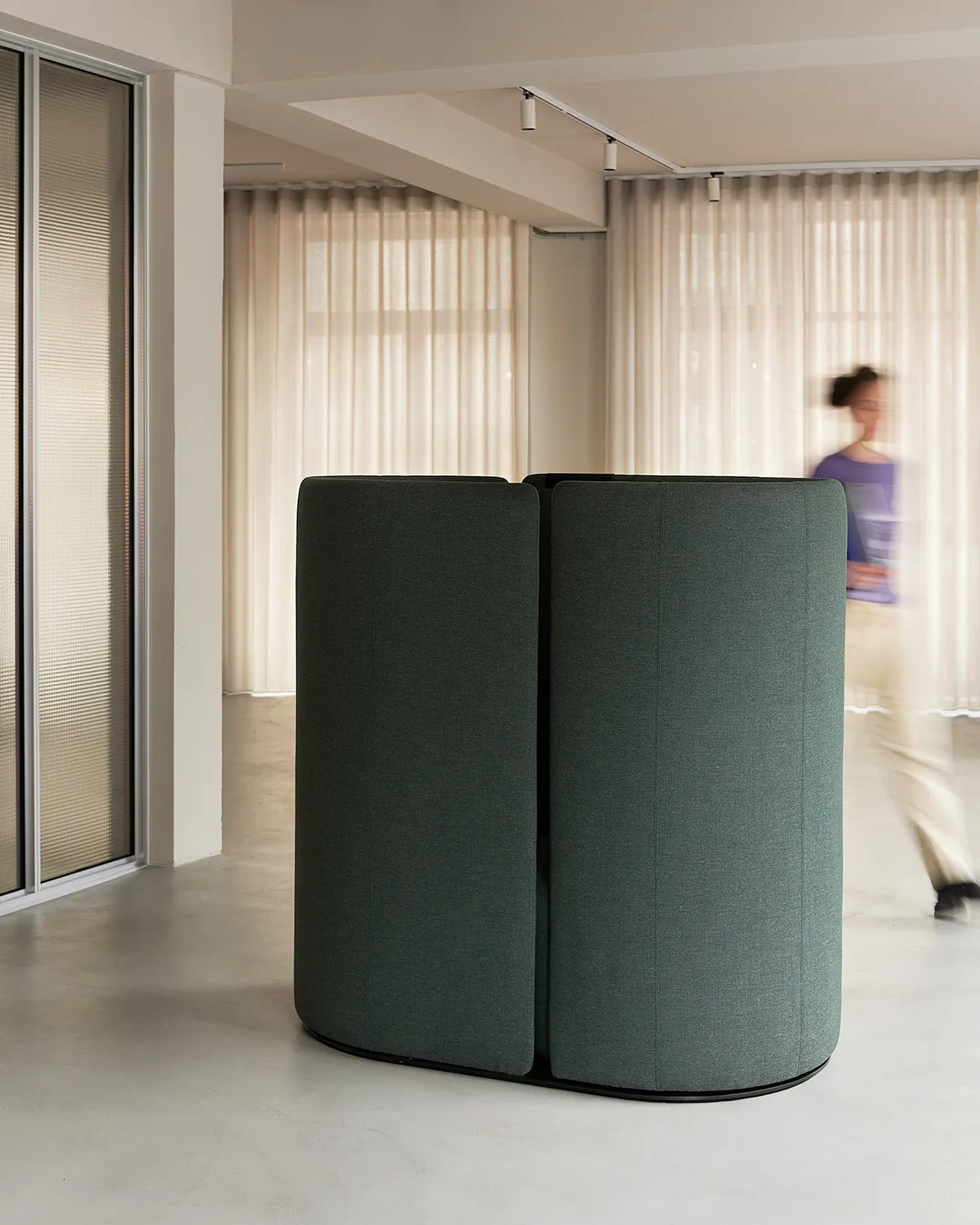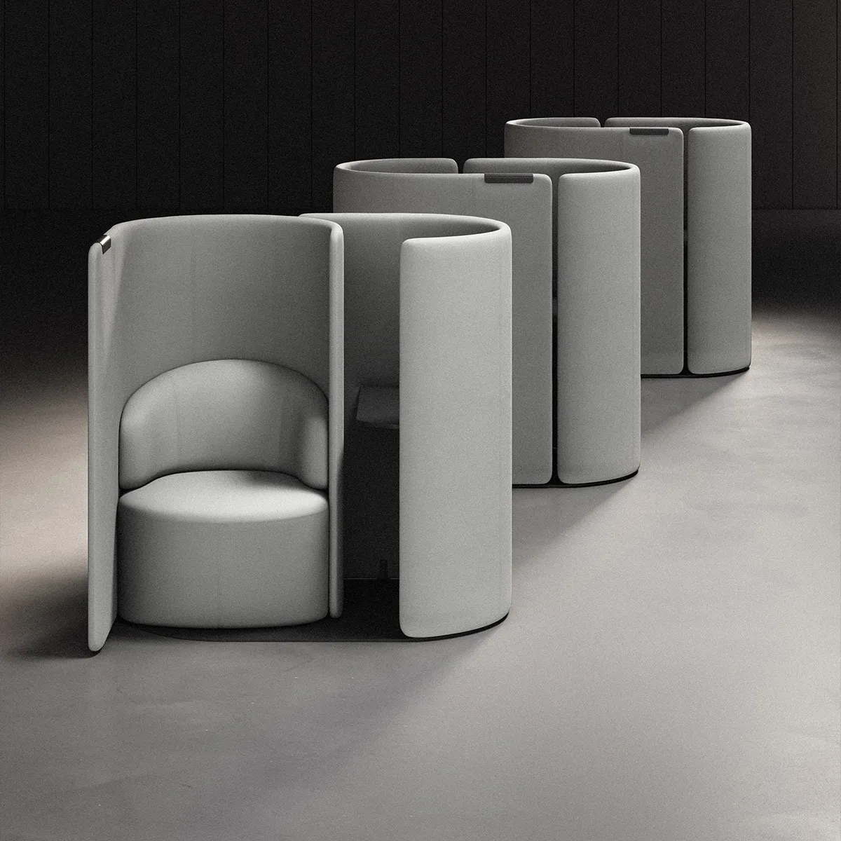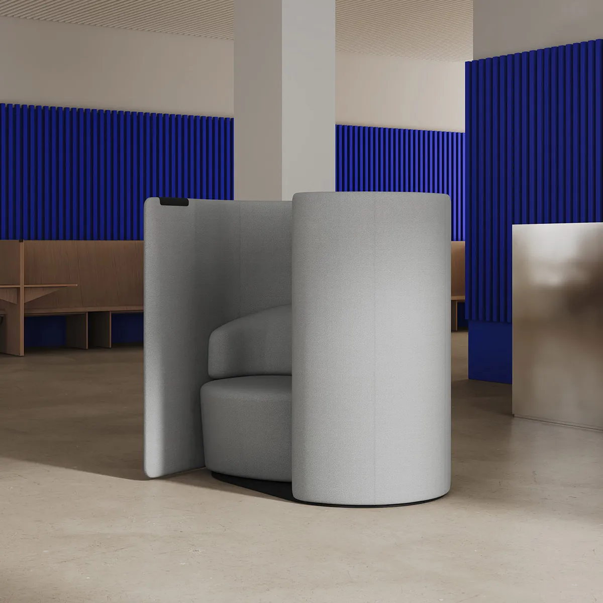 Tulipan is a new type of soft enclosure, a piece of furniture that offers a moment of separateness without the feeling of closing the door on its surroundings. Developed by London-based design studio Industrial Facility in response to the Annual Briefing on ‘defining’, Tulipan suggests a softer form for private space in the open plan. It’s not a room per se. Neither is it a phone booth. Instead, it’s a micro-quiet space where a comfortable seat and a small table work together to form an imminent architectural element.