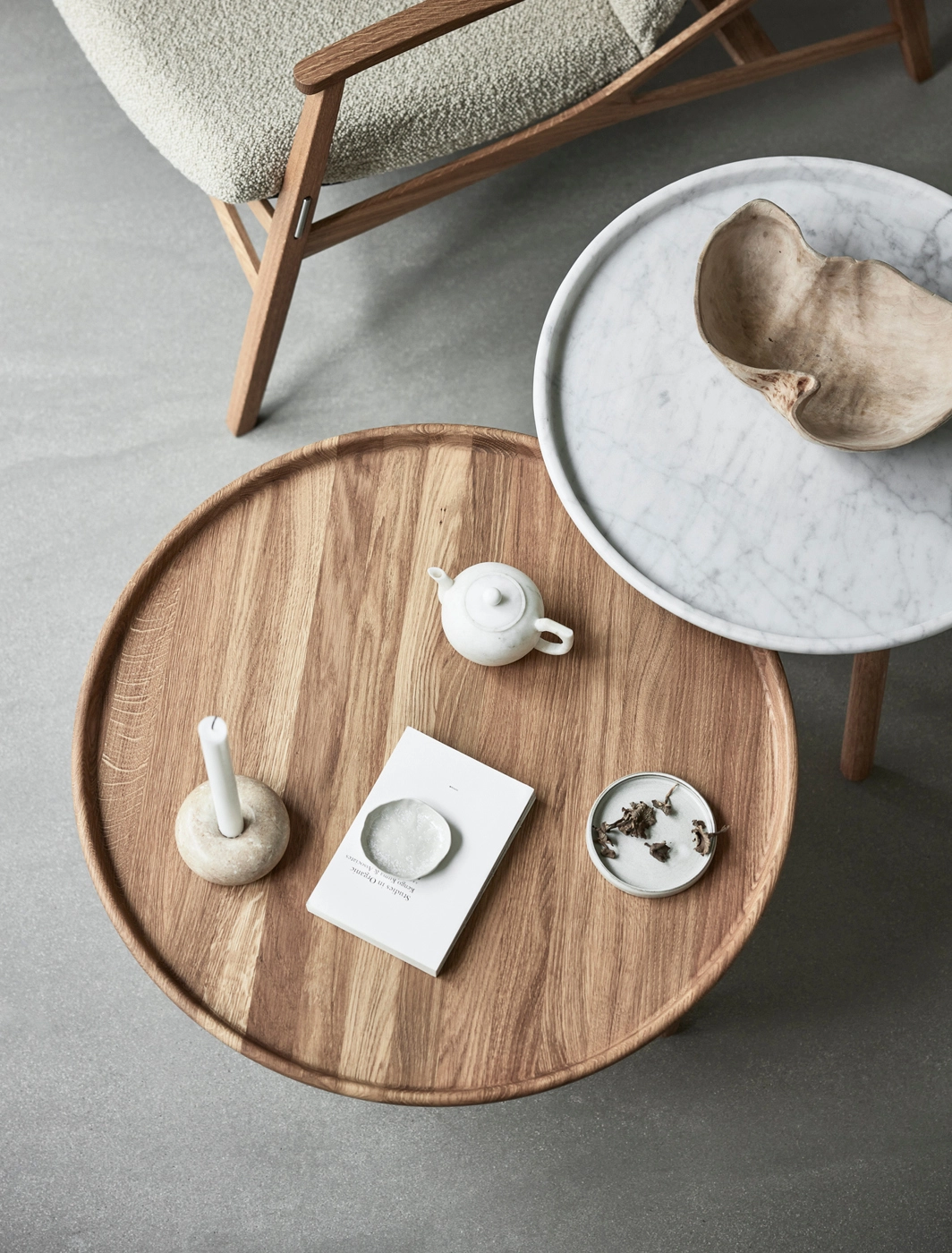 We’ve added two new heights to our wonderful Tureen table range, designed by Jonas Lindvall. The tables can be used as nesting or freestanding tables and are now available in the following heights: 29 (new), 36 (new), 43, 50 and 57 cm. The table tops are made of three different materials: Verde Alpin, green, Ø 38 cm, Cararra marble, white, Ø 52 cm, and solid oak Ø 38, 52 and 65 cm. In other words, all table tops are available in solid oak. The legs are made of solid oak.