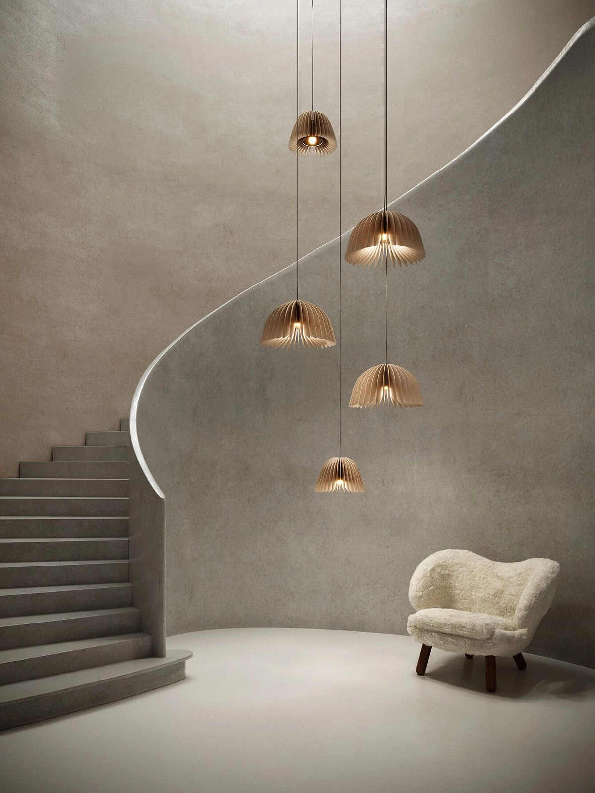 Each Verna lamp is carefully assembled by hand, with rings in black painted wood and a row of “wings” attached, 30 pieces on the smallest, 34 on the middle and as many as 60 pieces on the largest – creating a beautiful downward light that’s perfect for any space. Simo Serpola was inspired by the essence of spring when he designed this lamp with its pure and minimalistic design, and that’s why it’s named after the Finnish feminine name meaning spring-green. The natural wood materials used in Verna’s construction add an organic touch to its modern aesthetic, creating a serene and calming atmosphere that illuminates the beauty of spring all year round.