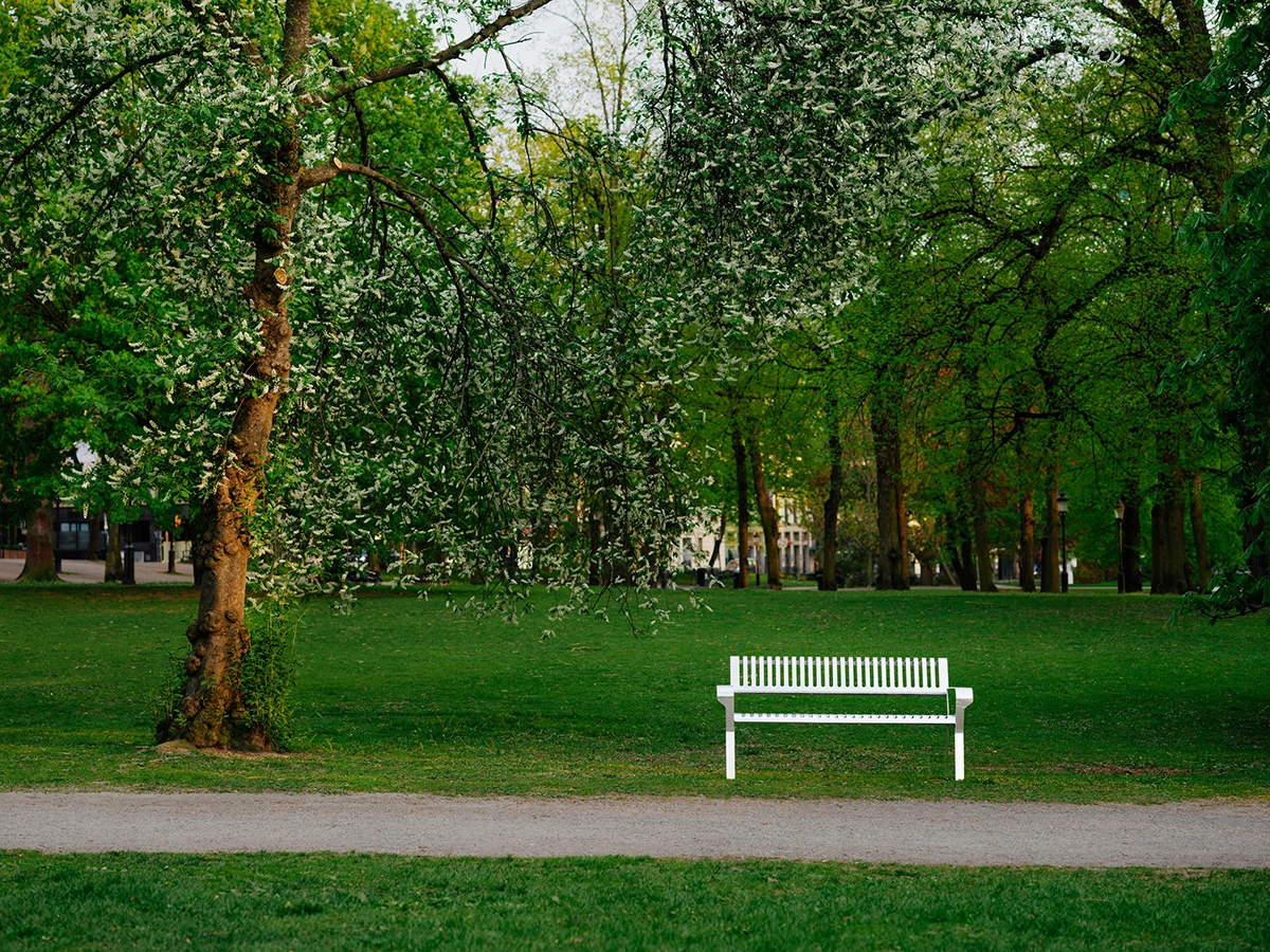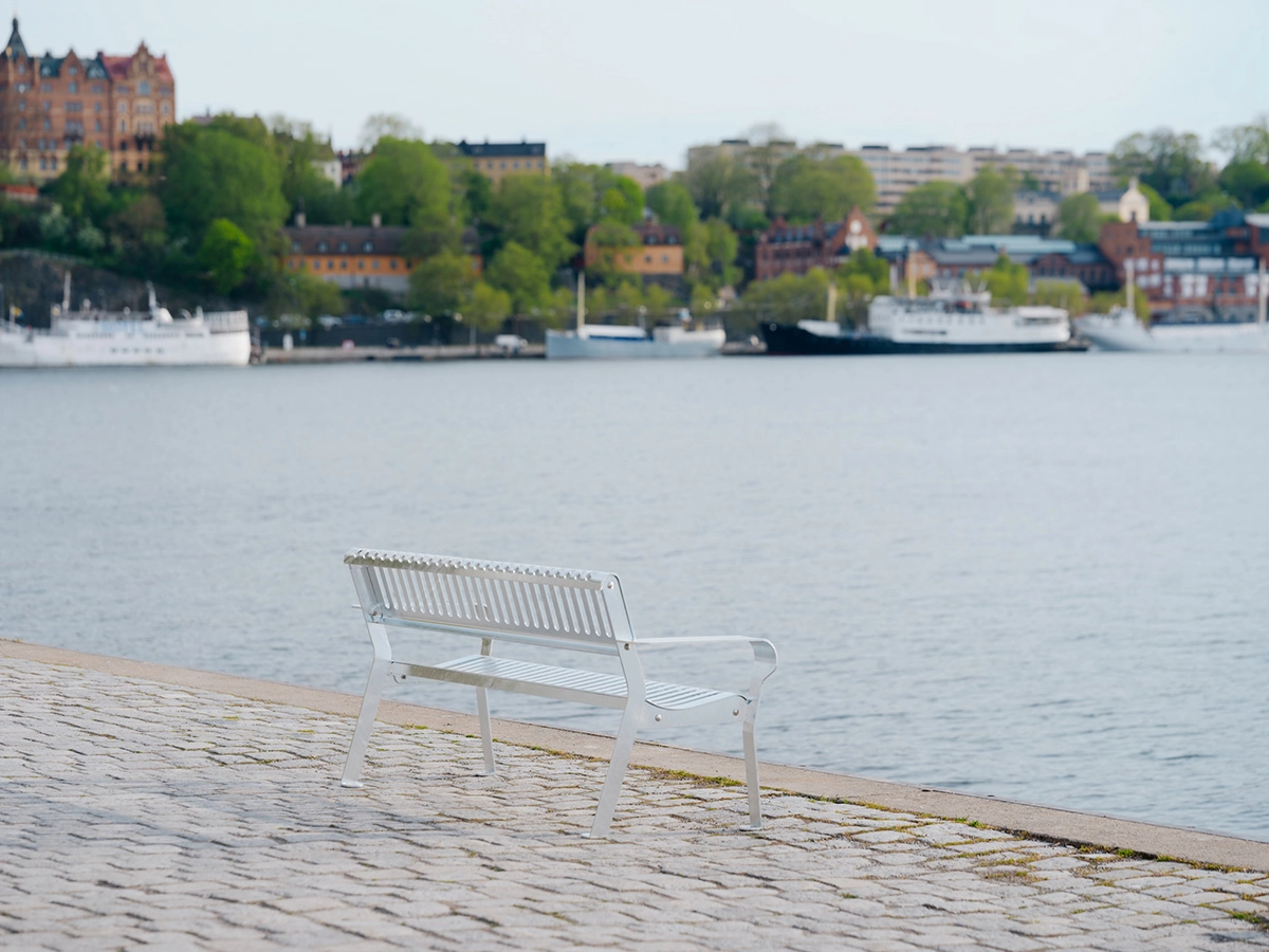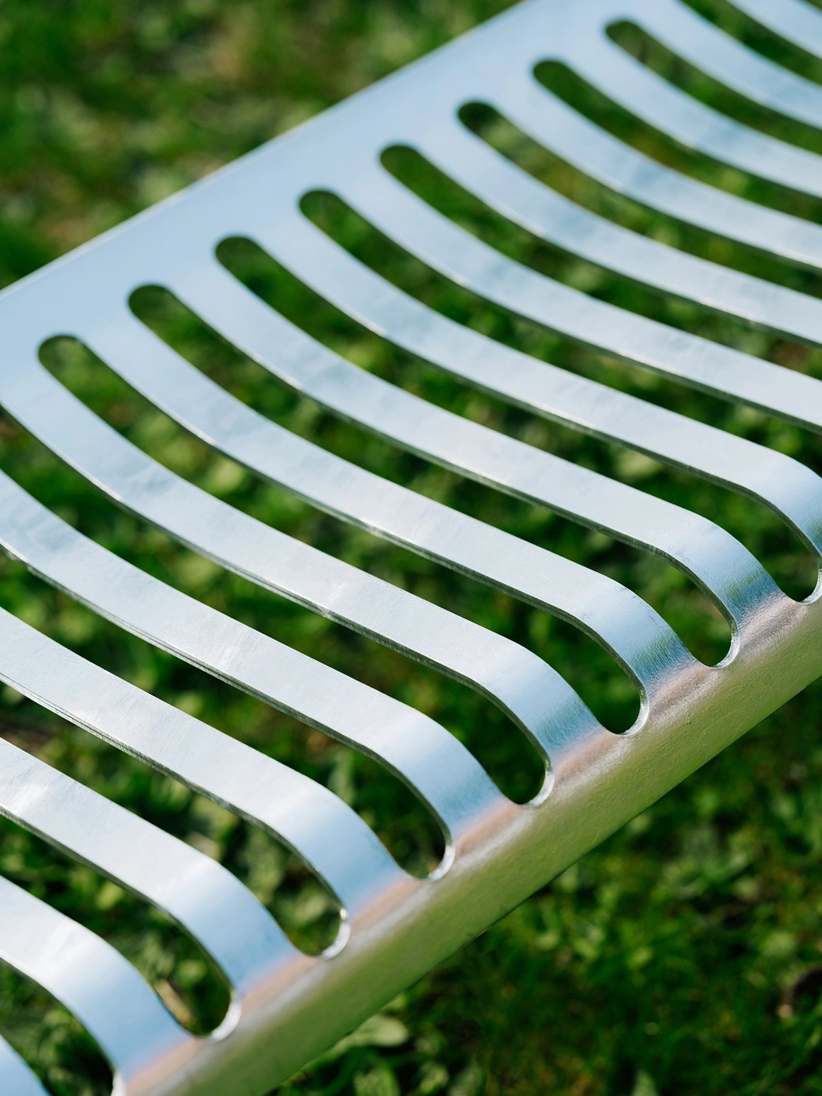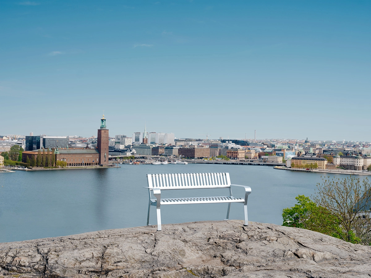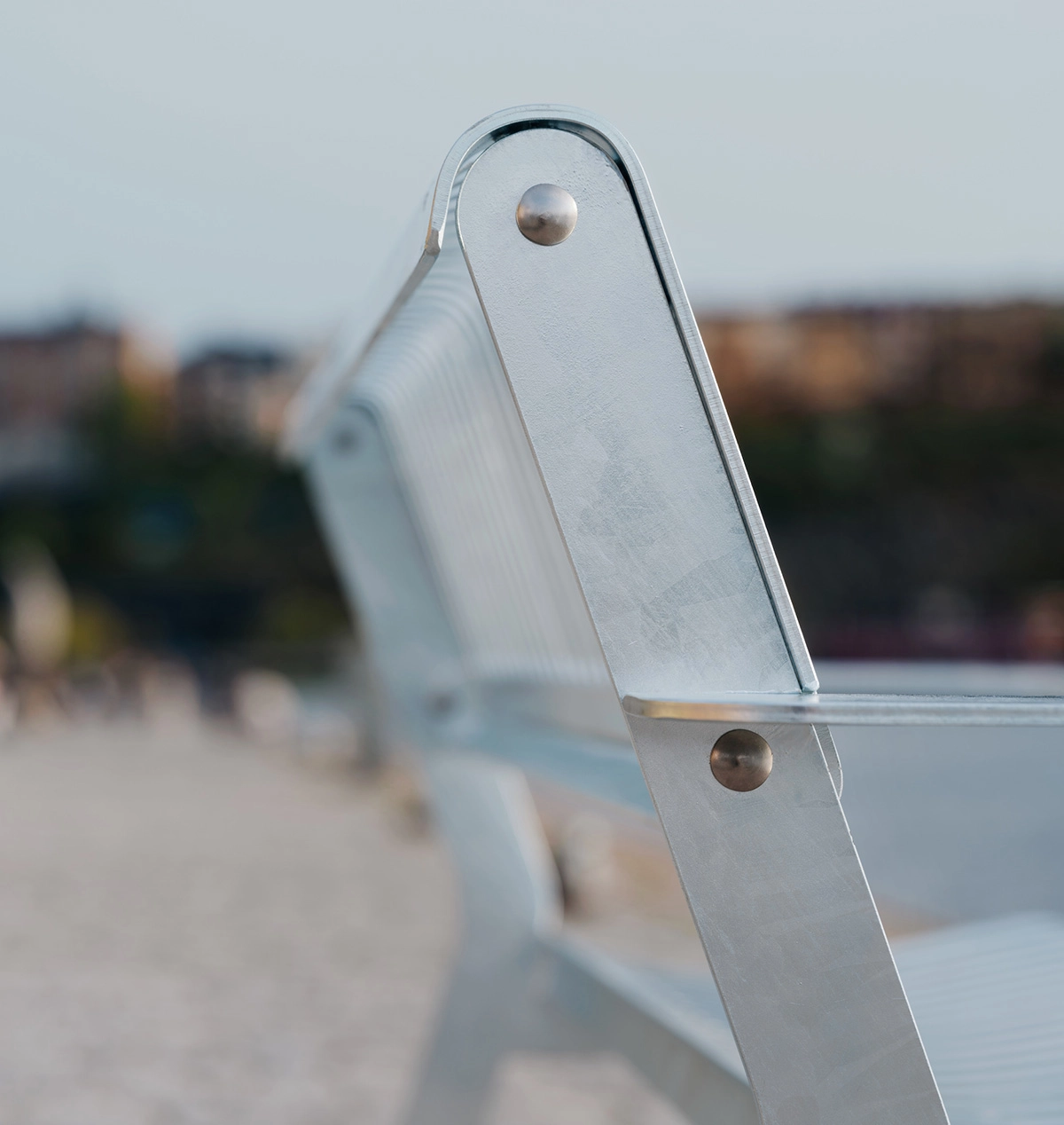 ”The main goal was to create a bench with as few emissions as possible. An outdoor bench for public environments must also withstand a lot of wear and tear. Therefore, a strong construction is important. We have striven to use as little material as possible but still maintain the strong construction. I think it should both radiate a metal feel and a tactility, but also look welcoming, hence the wide armrests which visually is inviting and functionally provide space for the coffee cup”, Emma Olbers explains.