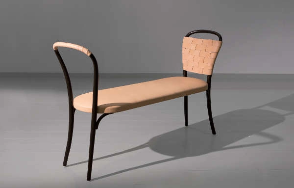 An elegant and sturdy bench in solid steambent beech or ash. A generous pad in vegetable tanned leather, upholstered with natural hairlok and wool.
