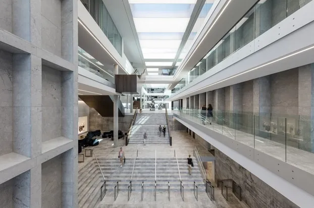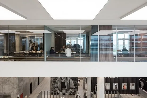 There will be about 800 workplaces here, plus showrooms, an auditorium, video and film studios, a large canteen and shared facilities for fashion shows and conferences. There is a three-storey underground car park with space for 450 cars and about 400 bicycle racks.