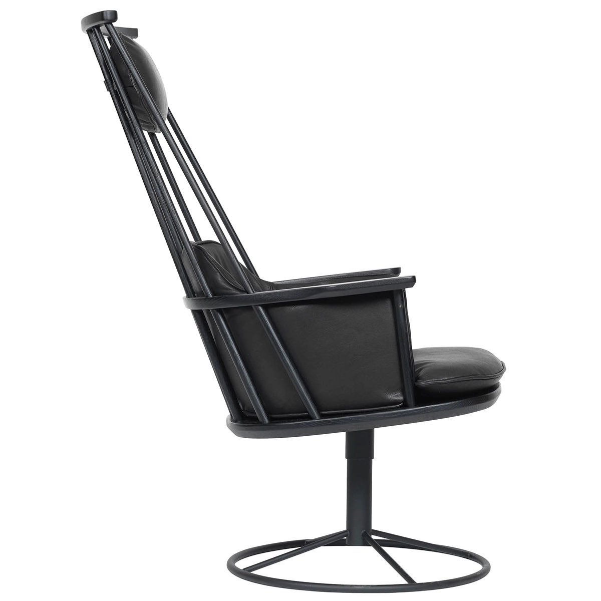 High with neck pillow or low, frame in oak, swivel base in steel.