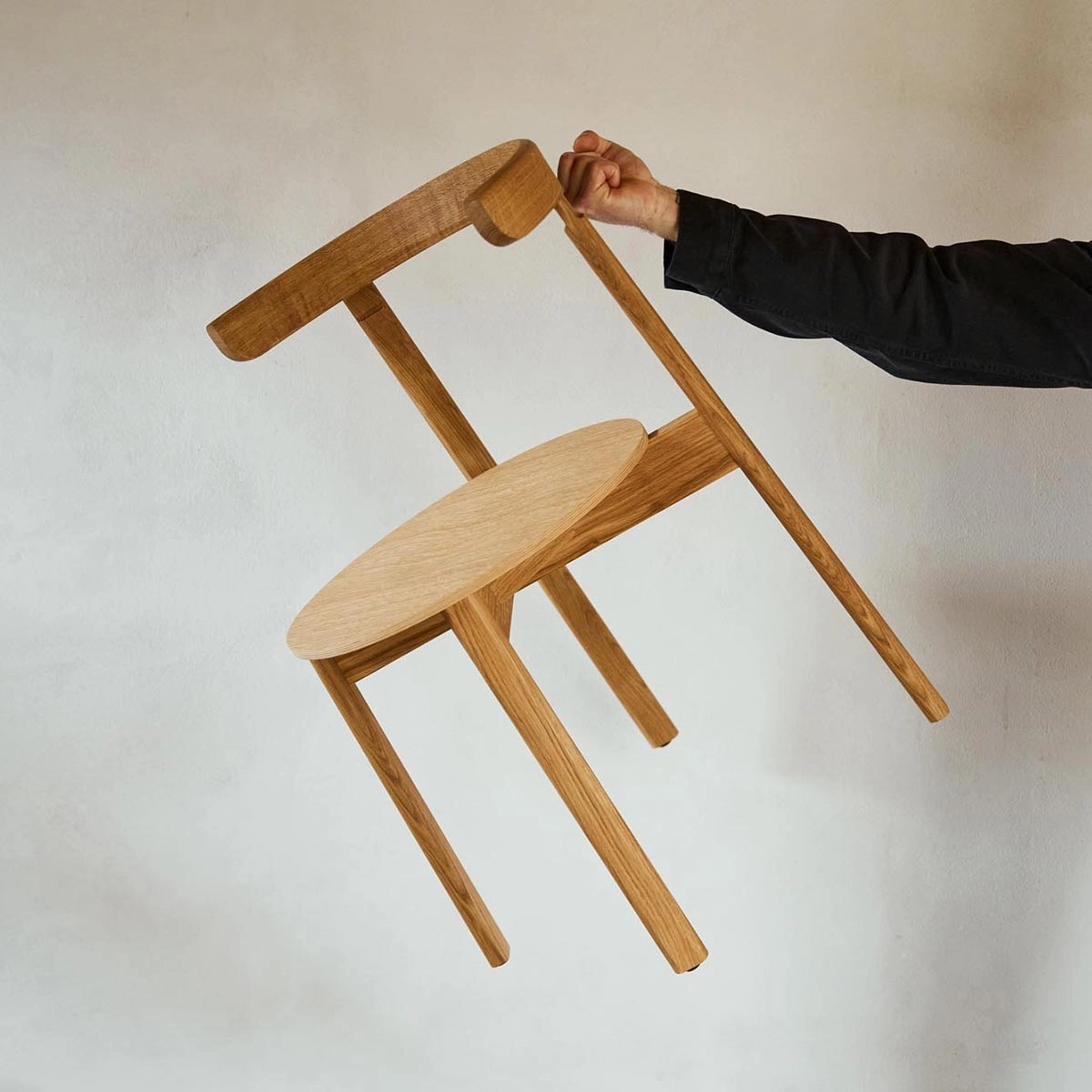 ‘With Lunar Chair I aimed to create a light and embracing chair. My goal was to make a chair that encourages different ways of sitting, rather than locking the user into a single position. The chair’s characteristic rounded backrest with integrated armrests is made from a single piece of solid wood. The form ensures optimal comfort with support for the sitter’s elbow and lower back and allows for a variety of seating positions. The rounded profiles are a consistently recurring feature in all the chair’s components and lend it a coherent, feminine and soft expression.’