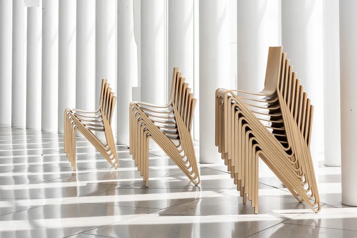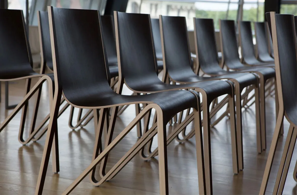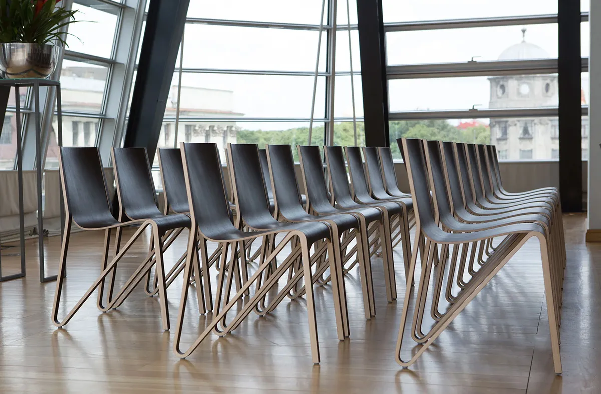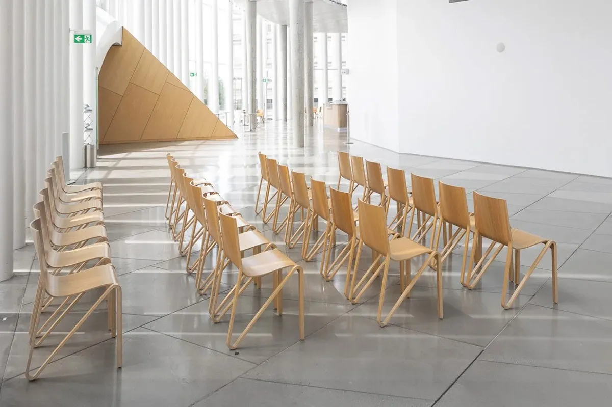 Zesty stacks safely and effective up to 15 chairs without trolley and is available in birch, oak, walnut, wenge or zebrano with different finishes.